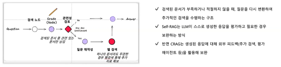 - LLM이 검색된 문서의 정확성·관련성을 점검